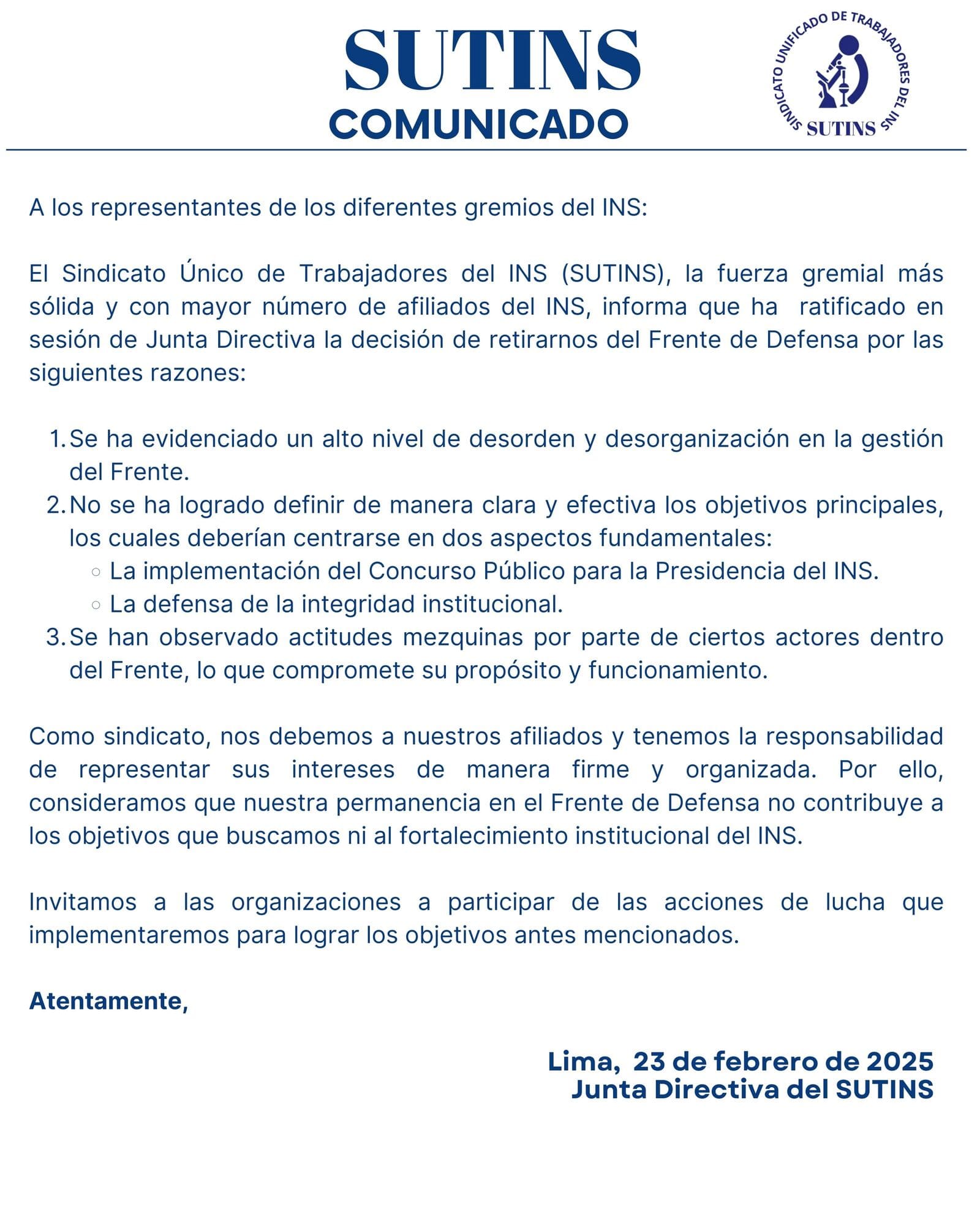 Tras evaluar el desenvolvimiento del Frente de Defensa del INS la Junta Directiva del SUTINS decidió retirarse del Frente de Defensa. La desorganización y la pérdida de los objetivos que llevaron a su conformación son las principales causas que motivan esta decisión.